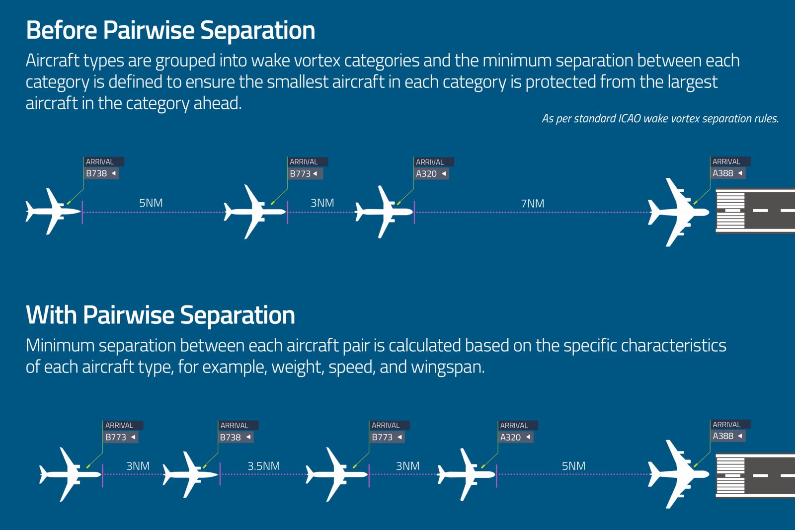 Pairwise is a new way of calculating the safe minimum separation between aircraft. "Traditionally, the gap between arrivals has been based on six categories that consider an aircraft’s weight and the wake it creates as it flies," NATS said. "Pairwise uses the specific characteristics of each individual aircraft type, supporting air traffic controllers to safely reduce the separation between some aircraft pairs, thereby increasing the overall flow of traffic and reducing airborne holding."